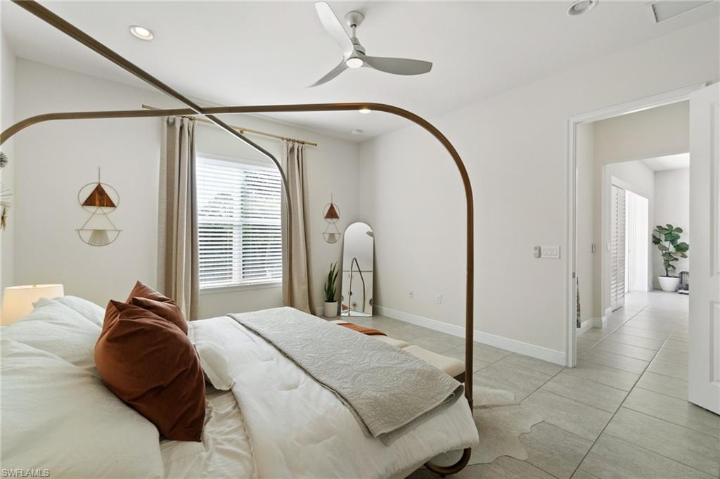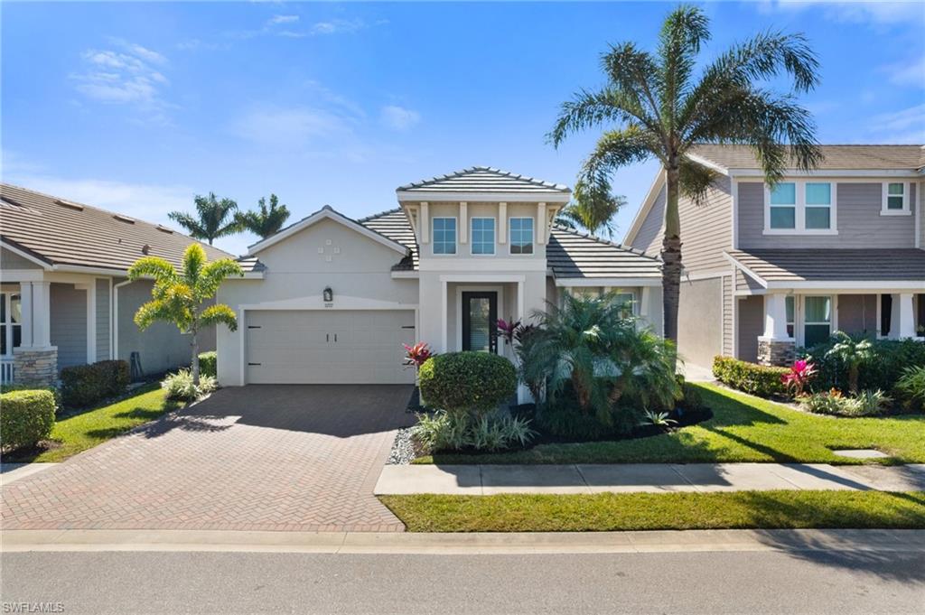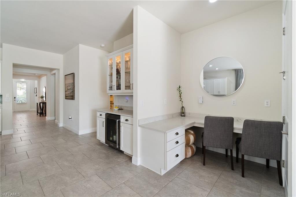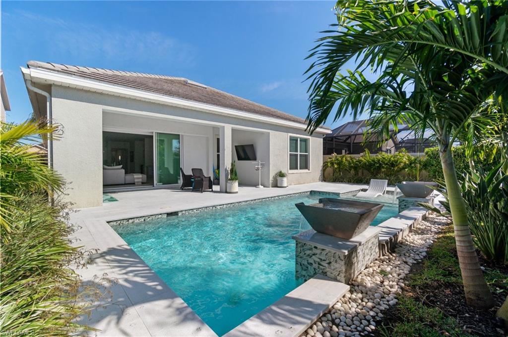 Welcome to this beautifully designed 3-bedroom plus den, 2.5-bathroom home in the gated community of Compass Landing. Featuring a spacious, open floor plan bathed in natural light, this home is perfect for both relaxation and entertaining. The heart of the home is the chef's kitchen, complete with KitchenAid appliances, a stunning quartz island, and a built-in wine cooler in the in-kitchen bar area. A convenient coffee or serving bar makes hosting a breeze. Just off the living room, an office space provides a quiet area for work or study. The owner's suite offers a spa-like retreat with dual sinks and a massive glass-enclosed shower. Two additional bedrooms share a Jack-and-Jill bathroom for added convenience. Step outside to your private backyard oasis, featuring a custom pool with three water features, a sun-shelf, and swim-up bar seating - perfect for entertaining. Gorgeous leather marble tile and lush landscaping complete the tropical ambiance. Located in a golf-cart friendly community with a clubhouse, pool, fitness center, and a full events calendar, this home is just minutes from Founder's Square and vibrant North Naples dining and shopping.